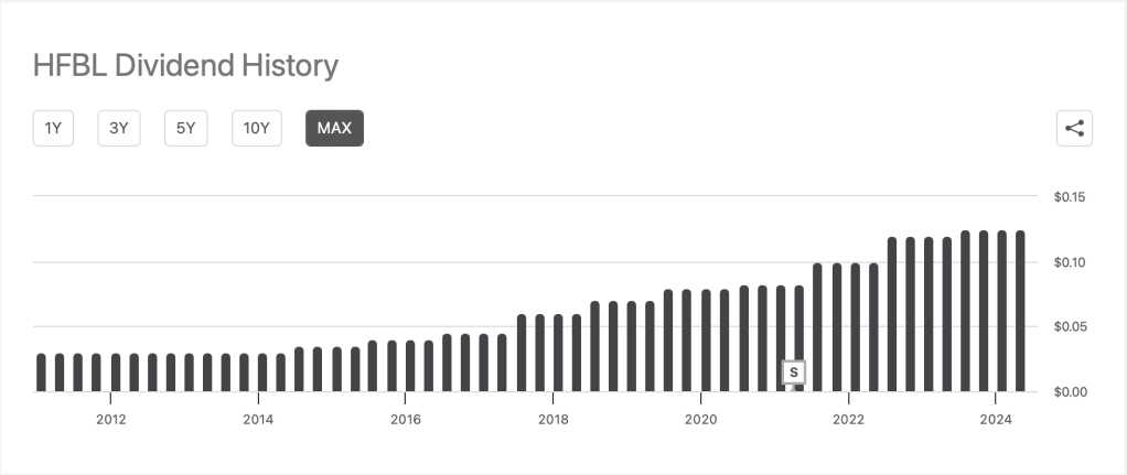 Dividend Reliability: HFBL has a history of providing shareholders with stable and reliable dividends, making it an ideal candidate for investors focused on generating passive income. This is particularly appealing for the “A Dollar A Day” strategy, where the aim is to build a portfolio that not only grows in value but also delivers a steady income stream through dividends. HFBL’s track record of dividend payouts reflects its financial health and commitment to returning value to its shareholders.