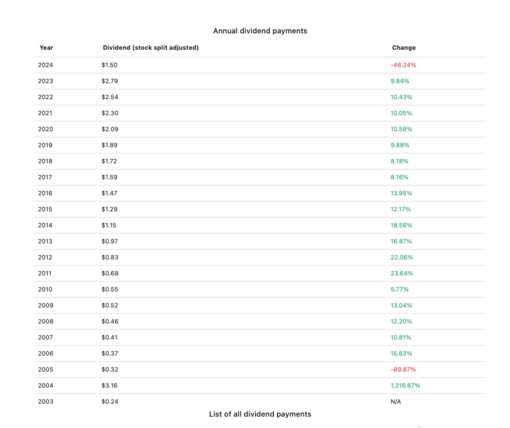The graph illustrates Microsoft’s stable dividend history, marked by a steady increase over the years. This trend highlights the company’s ability to enhance shareholder value through careful financial management and robust earnings. Supported by a solid business model that generates significant free cash flow, Microsoft manages to fund dividends comfortably while investing in key areas such as cloud computing and AI.