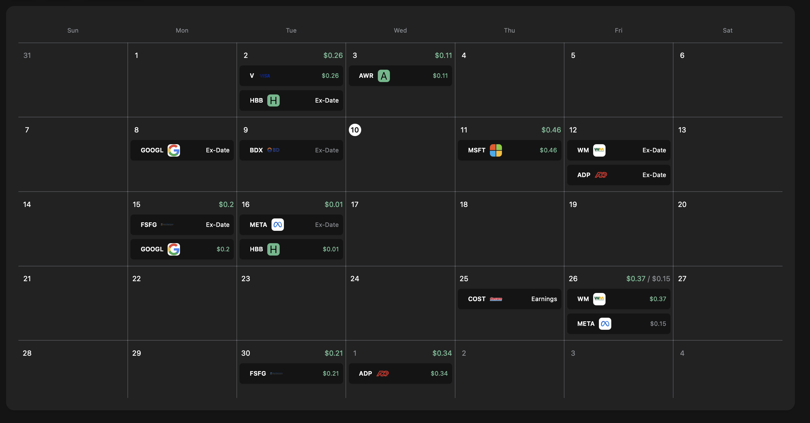 Leveraging DivTracker’s comprehensive calendar functionality, we identify several critical capital return dates for investors to monitor closely. Microsoft (MSFT) had a dividend payable on September 11 (ex-date August 21) at $0.83 per share. Alphabet (GOOGL) had an ex-date of September 8 for a dividend of $0.21. Visa (V) has an upcoming ex-date of September 12 for a dividend of $0.59. Meta (META) has an ex-date of September 15 for $0.525. Looking ahead to October, Apple (AAPL) has an ex-date of November 10 for $0.26, and companies like Costco (COST) are reflecting evolving payout strategies among growth-oriented stocks. These upcoming dividend payments, tracked effectively through DivTracker, provide valuable insights for maximizing income opportunities and managing portfolio cash flow.